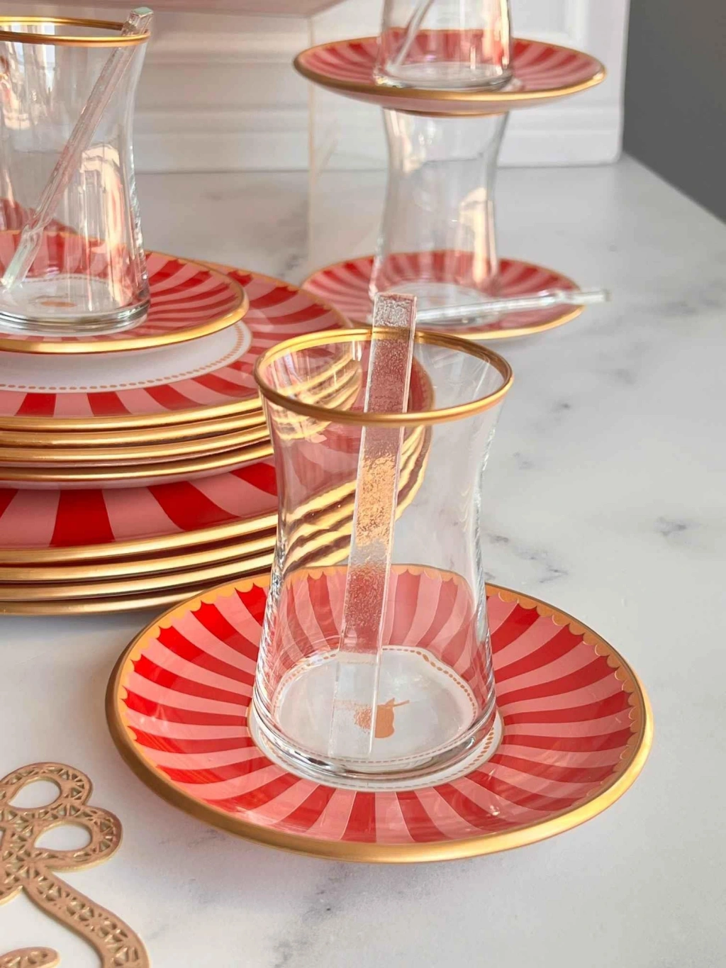 6 adet altın yaldızlı cam çay tabağı