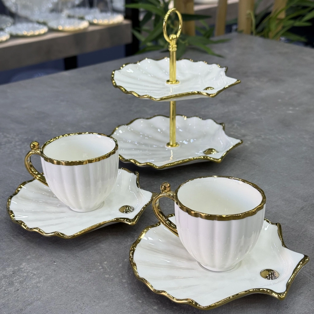 Lüx Porselen İstiridye Sunumlu 2 Li Fincan Takımı Gold
